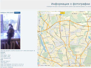 Приложение позволяет прочитать и вывести на экран всю информацию из метаданных выбранной фотографии. Фотографию можно открыть как через инспектор файлов, так и путем перетаскивания значка файла в окно браузера. При наличии данных по геолокации, на карте маркером выделяется местоположение съемки.